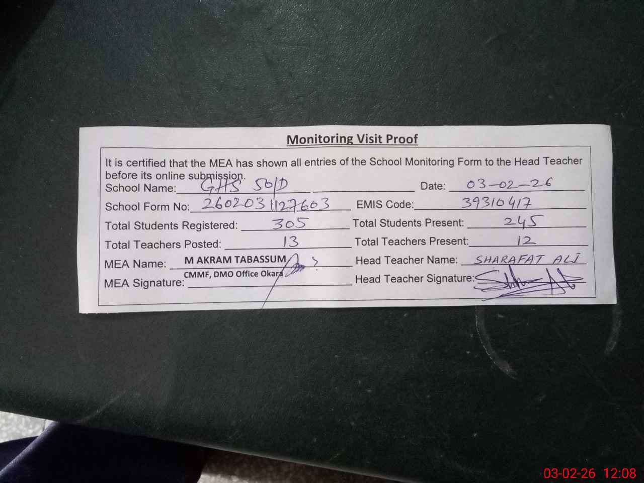 | Attendance Register | Head Teacher | MEA with School | Visit Proof |