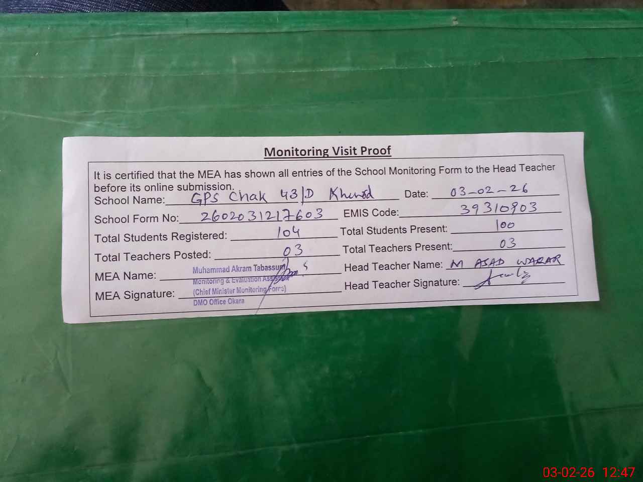 | Attendance Register | Head Teacher | MEA with School | Visit Proof |