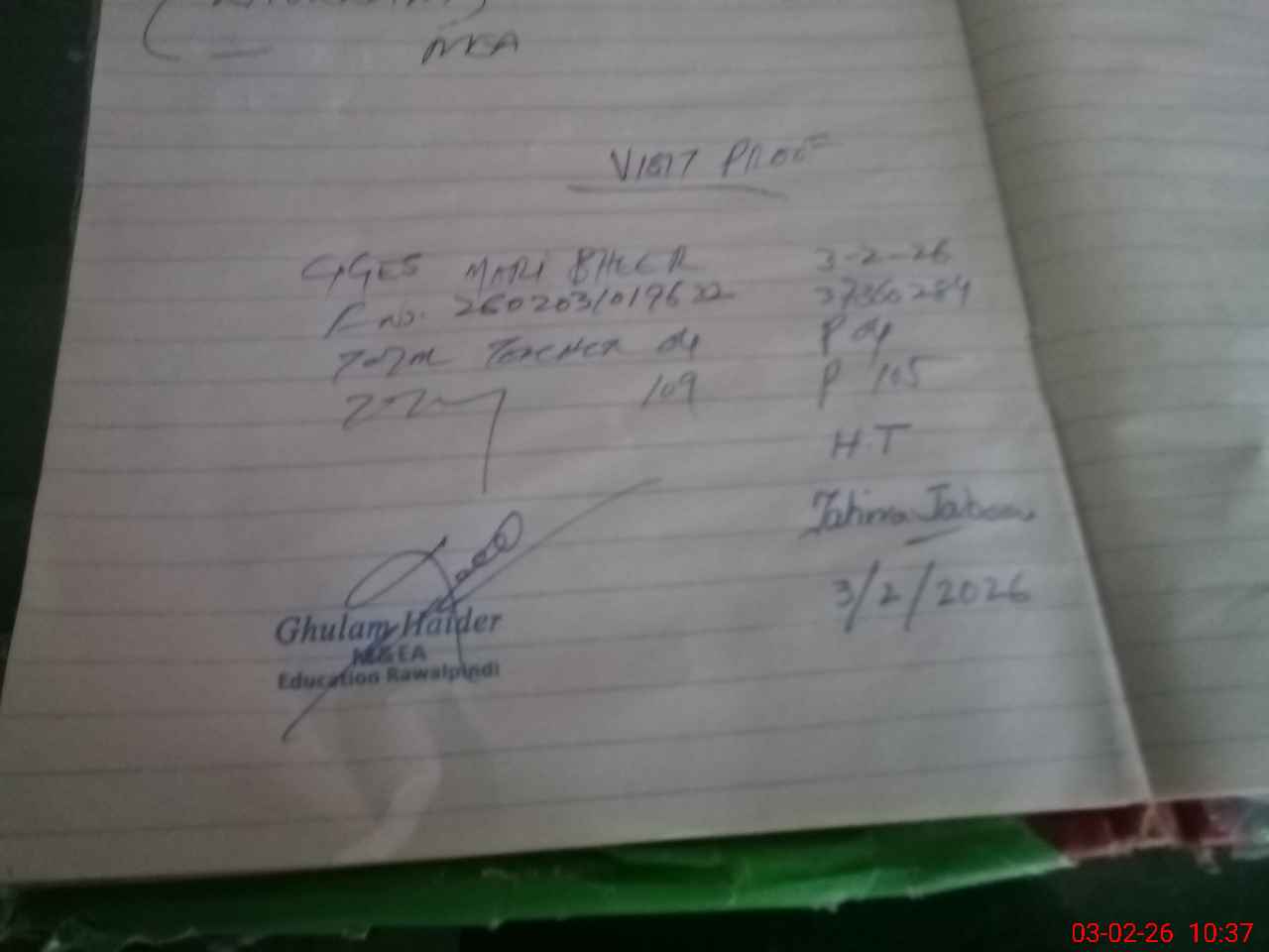 | Name: TA**** JA**** Designation: (School Headmaster's/Headmistress's) PTC/JV Phone/Cell Number: 03**** |