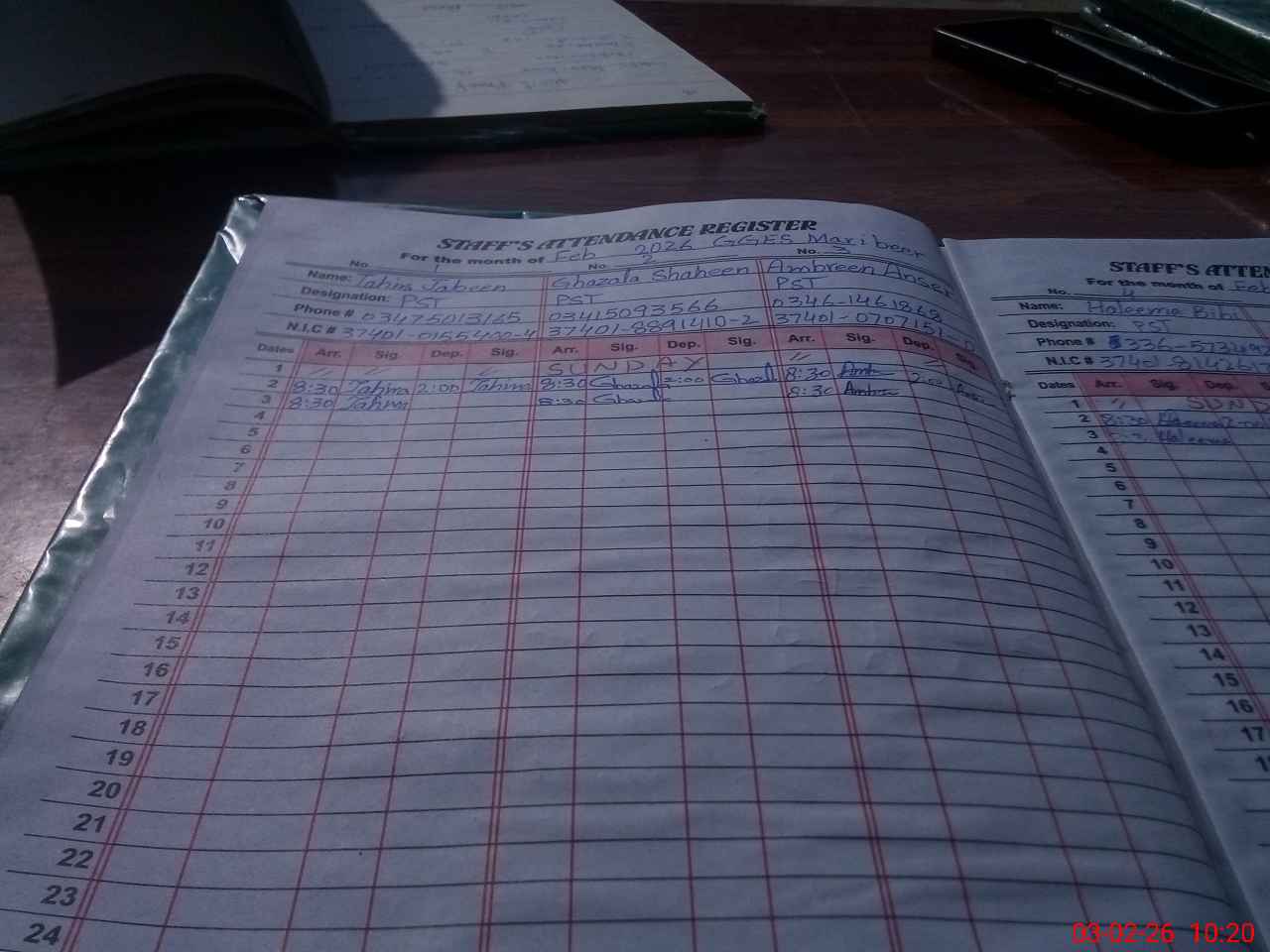 | CNIC | Full Name | Designation | R/C | Absence During Last Calender Month |
