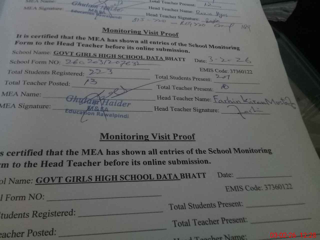 | Remarks (Use Separate Page if Required): Head teacher is on official duty so NSB and FTF has not been shown properly | |||||