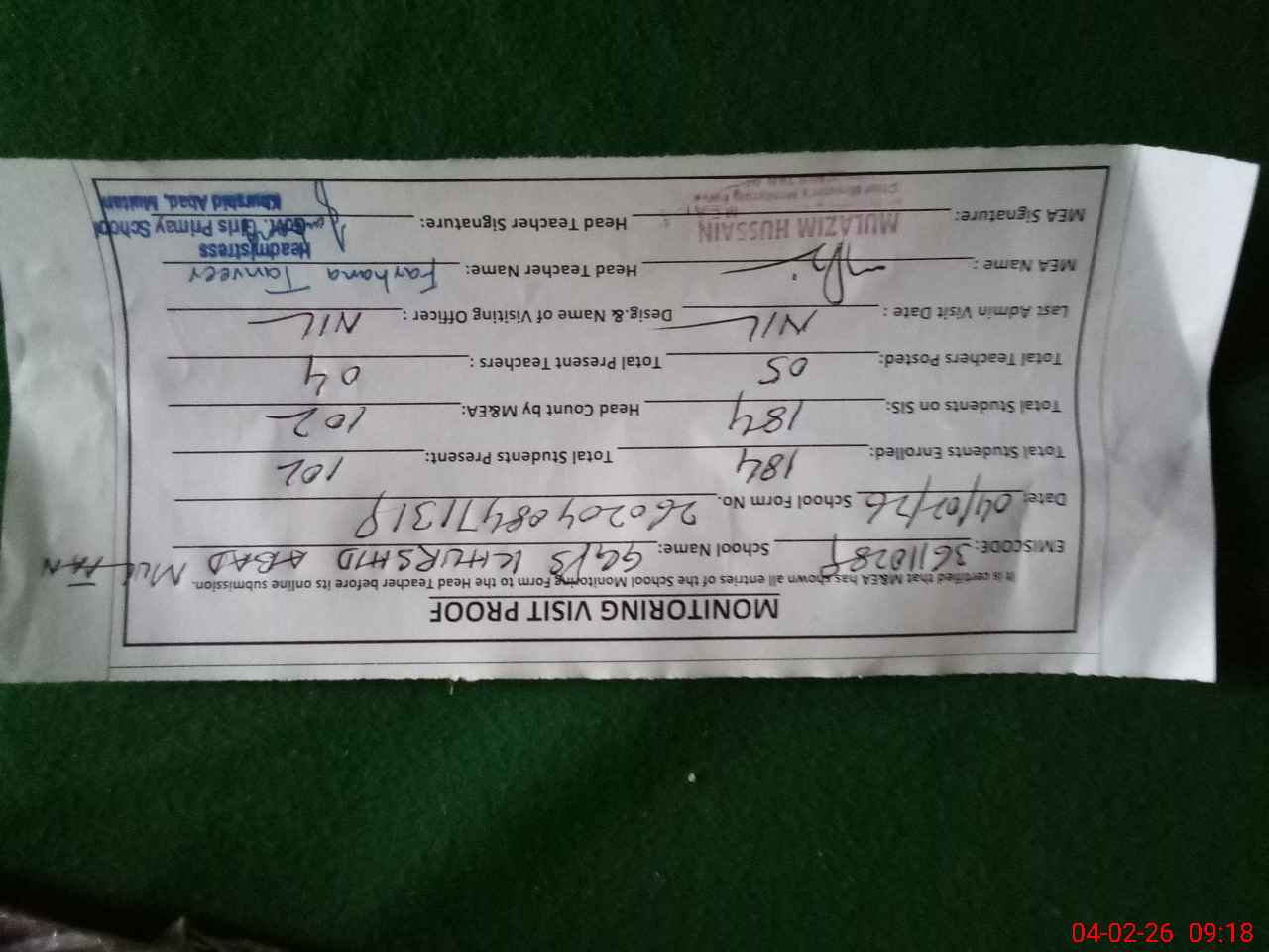 | Attendance Register | Head Teacher | MEA with School | Visit Proof |