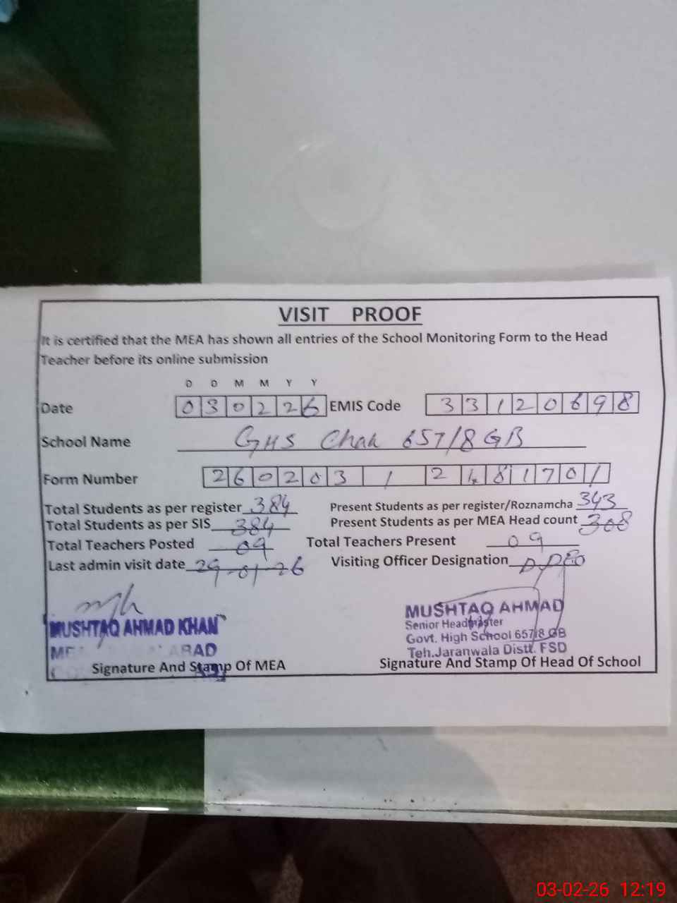| Attendance Register | Head Teacher | MEA with School | Visit Proof |
