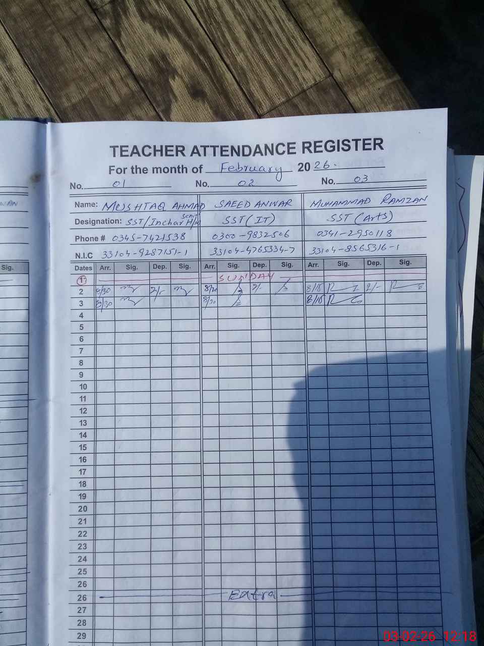 | CNIC | Full Name | Designation | R/C | Absence During Last Calender Month |