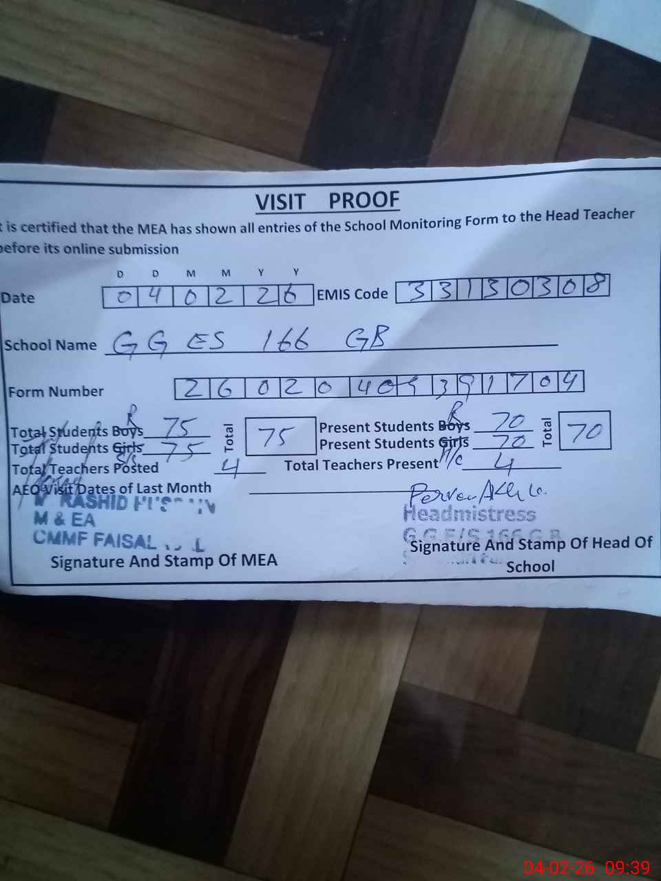 | Attendance Register | Head Teacher | MEA with School | Visit Proof |