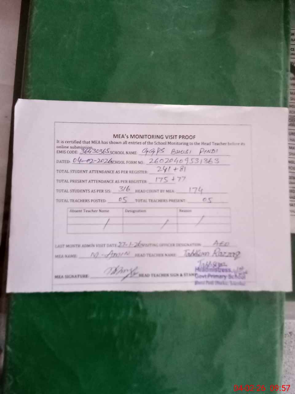| Attendance Register | Head Teacher | MEA with School | Visit Proof |