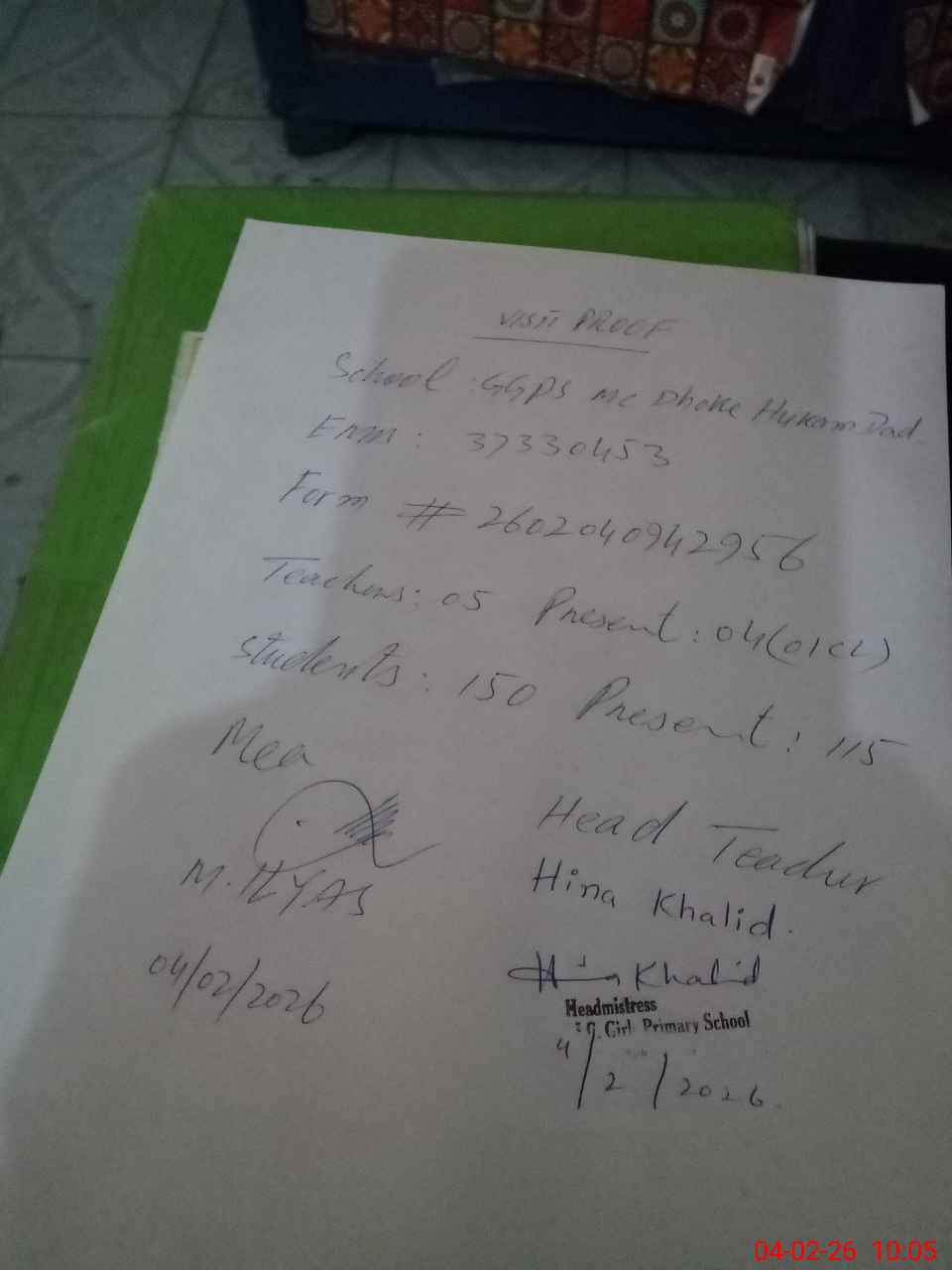 | Attendance Register | Head Teacher | MEA with School | Visit Proof |