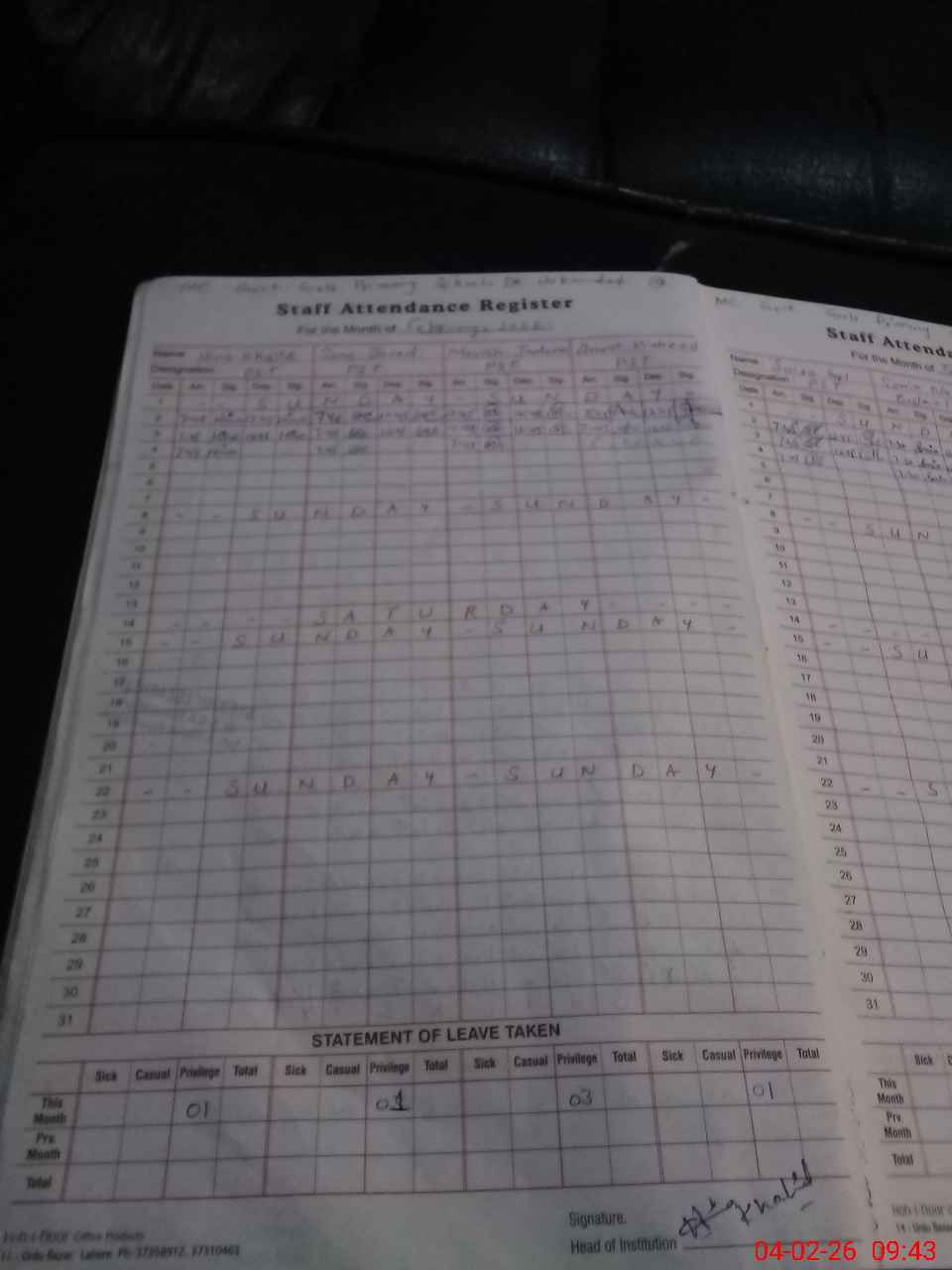 | Leave | Duty | Absent | Maternity | Medical | Ex- Pak |