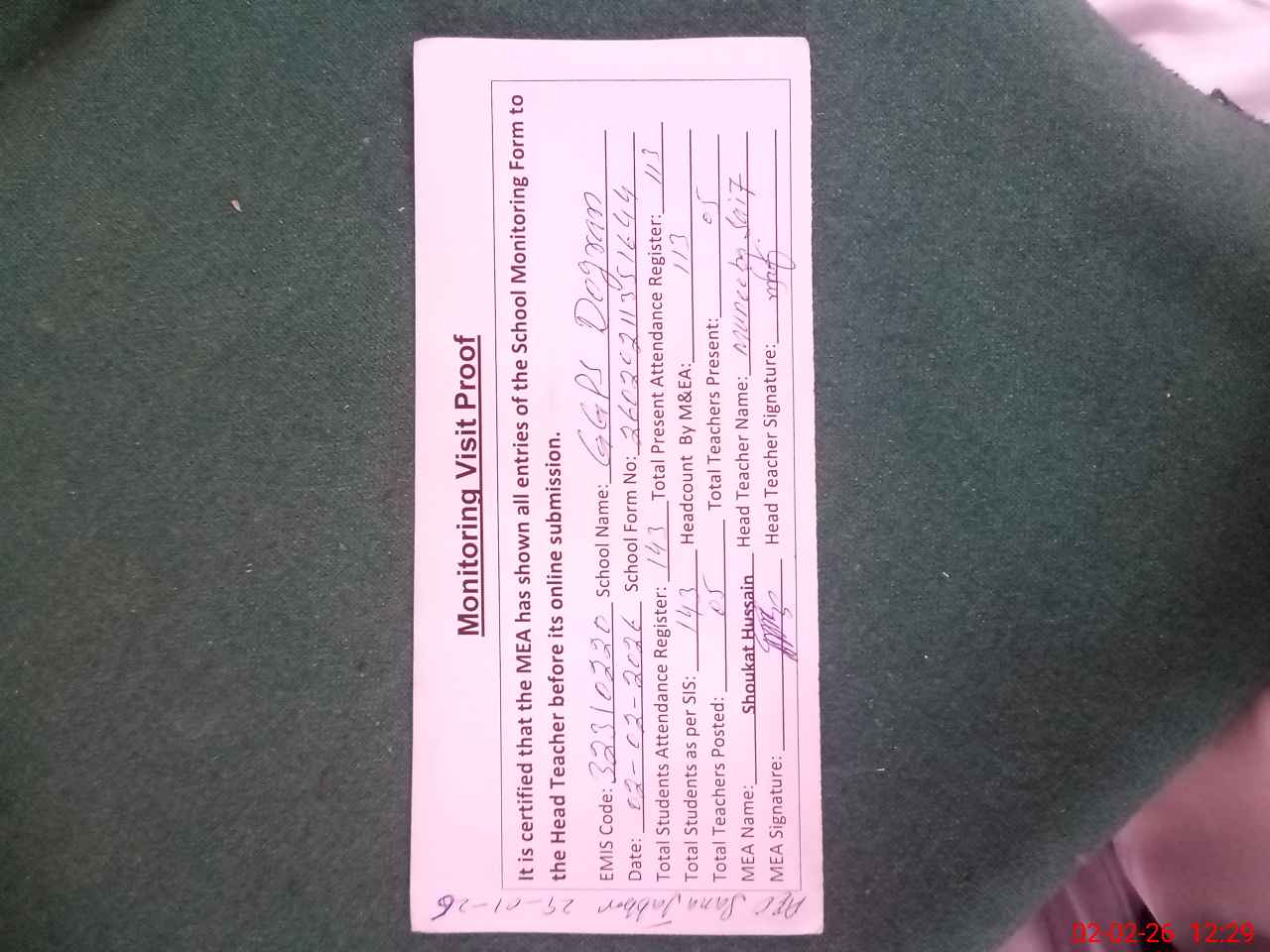 | Attendance Register | Head Teacher | MEA with School | Visit Proof |