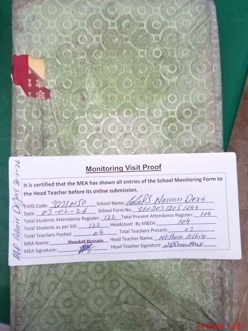 | Attendance Register | Head Teacher | MEA with School | Visit Proof |