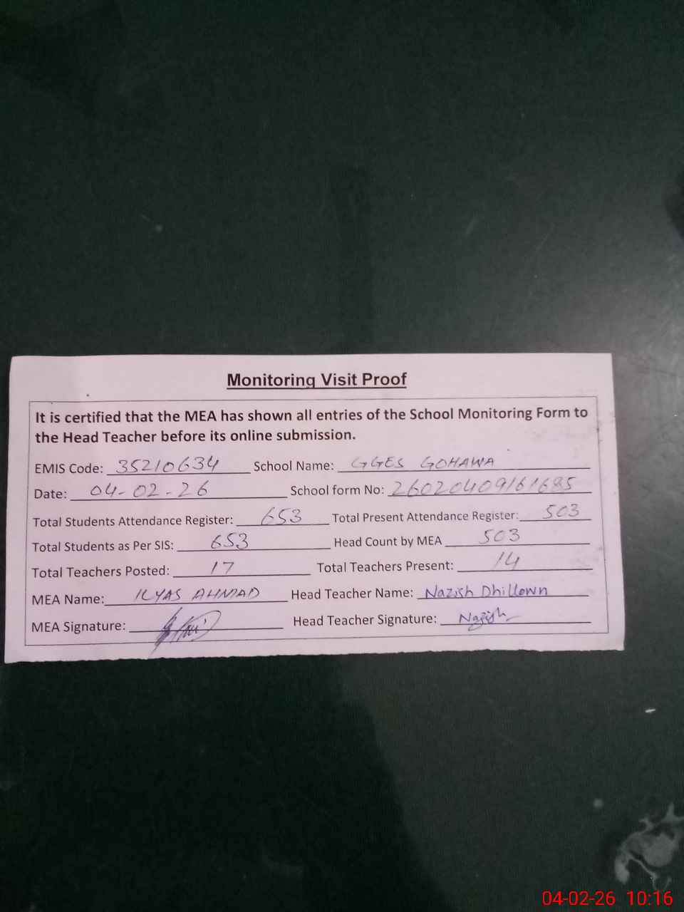 | Attendance Register | Head Teacher | MEA with School | Visit Proof |