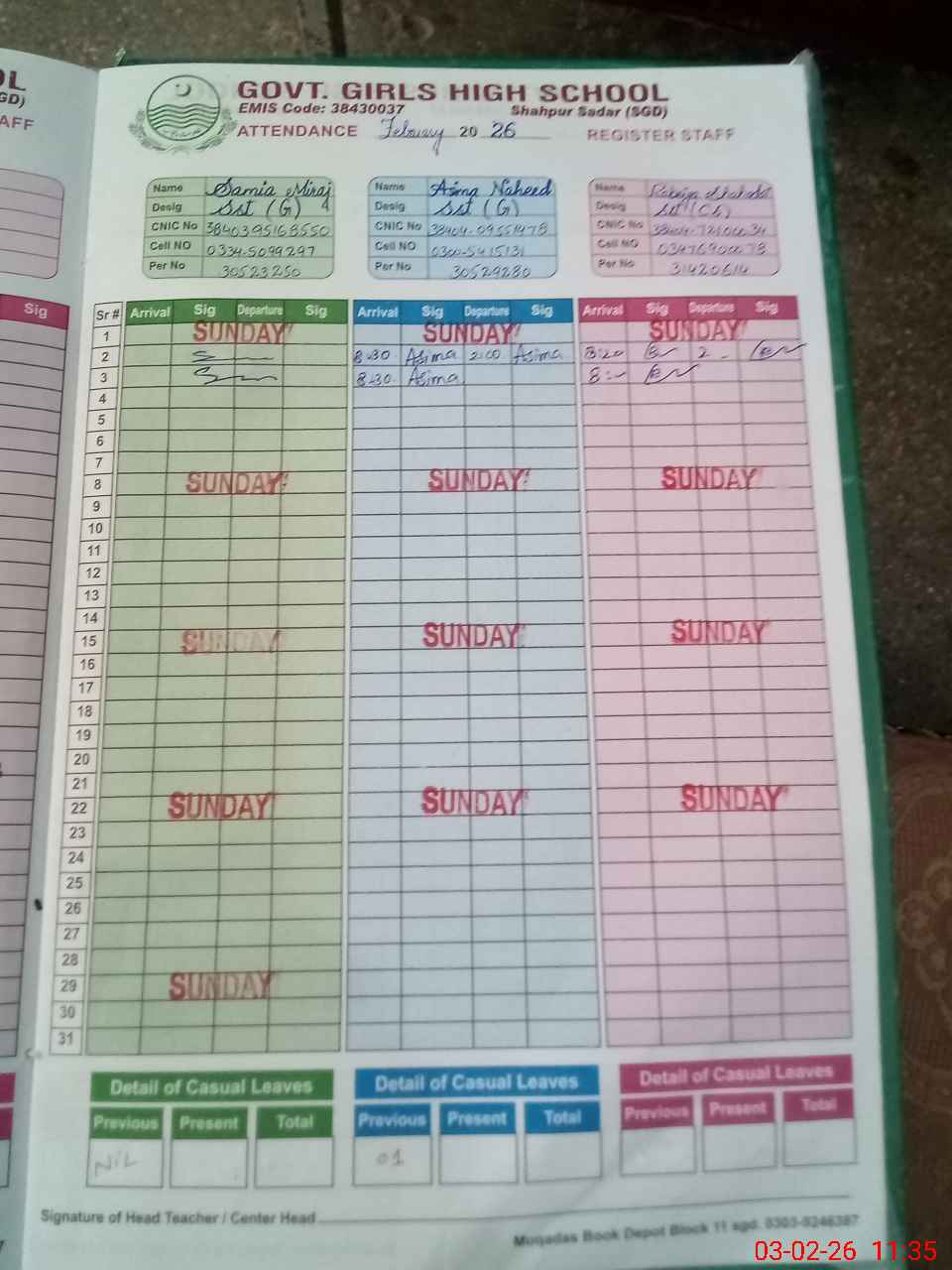 | CNIC | Full Name | Designation | R/C | Absence During Last Calender Month |