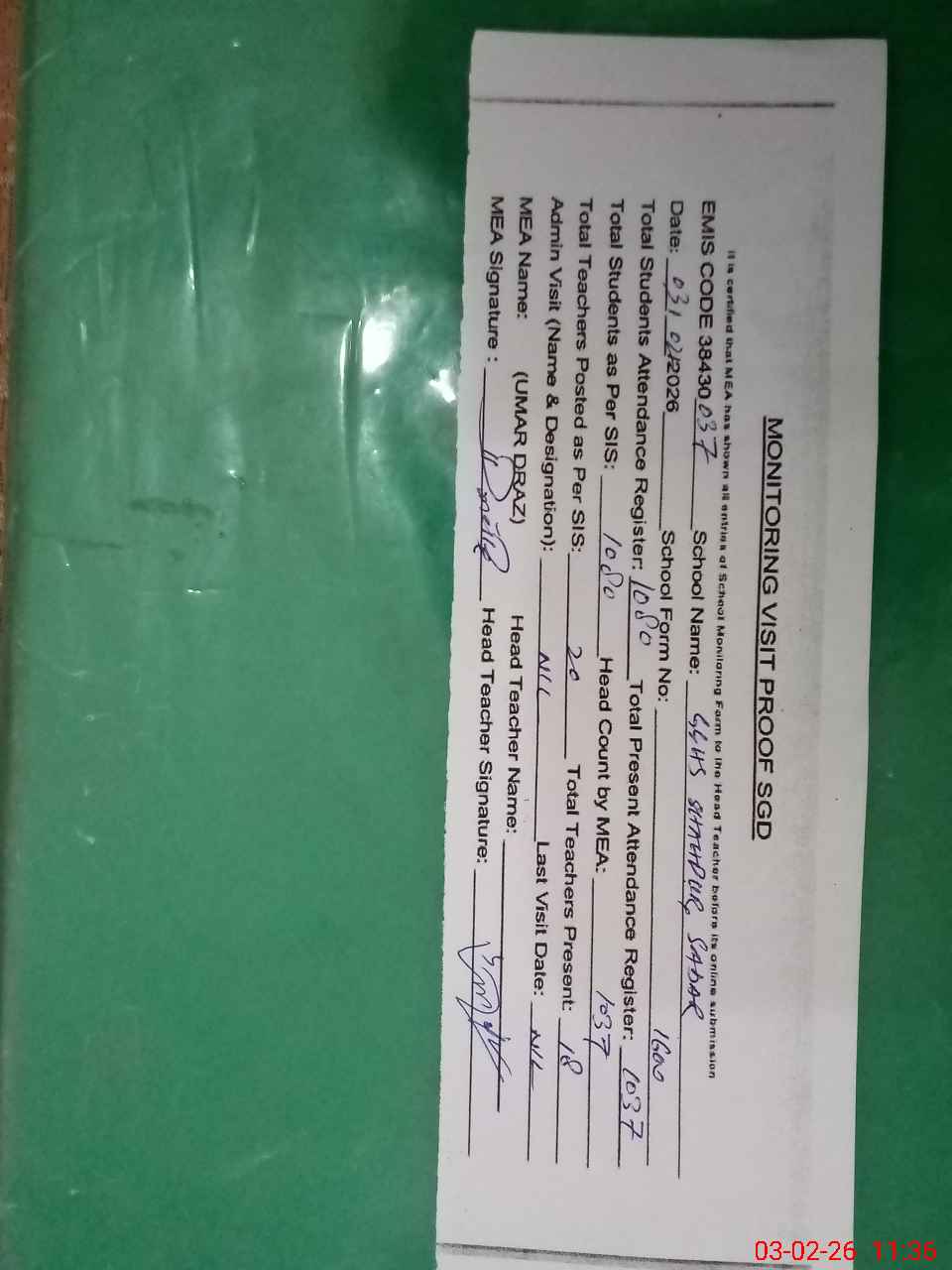 | Attendance Register | Head Teacher | MEA with School | Visit Proof |