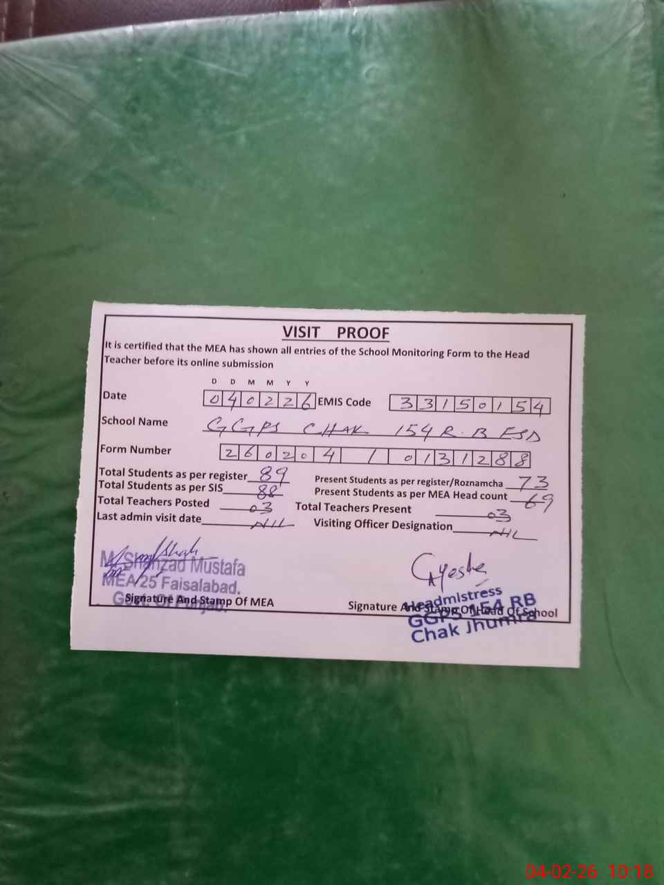 | Attendance Register | Head Teacher | MEA with School | Visit Proof |