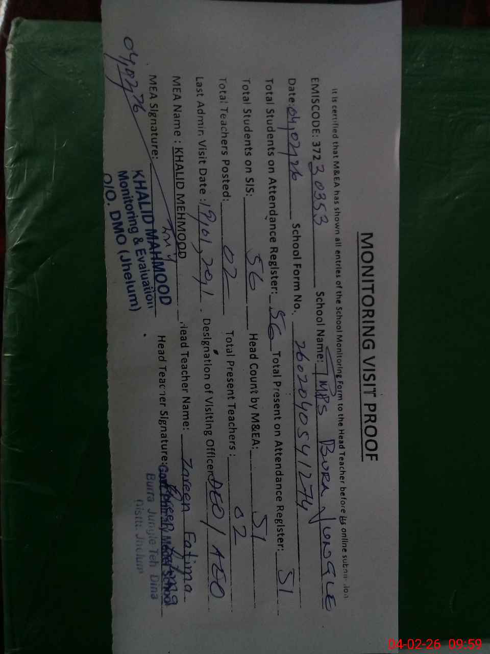 | Attendance Register | Head Teacher | MEA with School | Visit Proof |