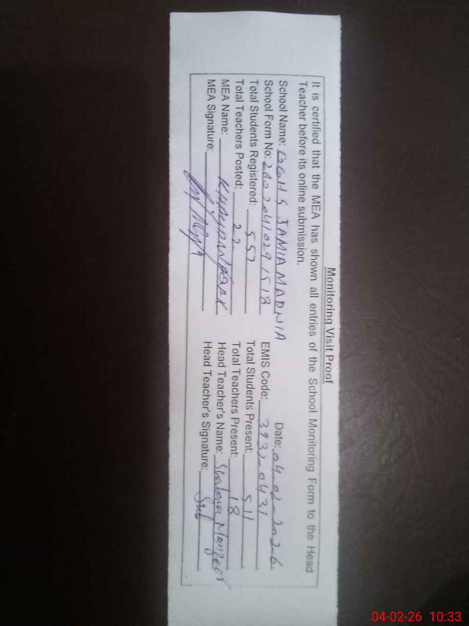 | Attendance Register | Head Teacher | MEA with School | Visit Proof |