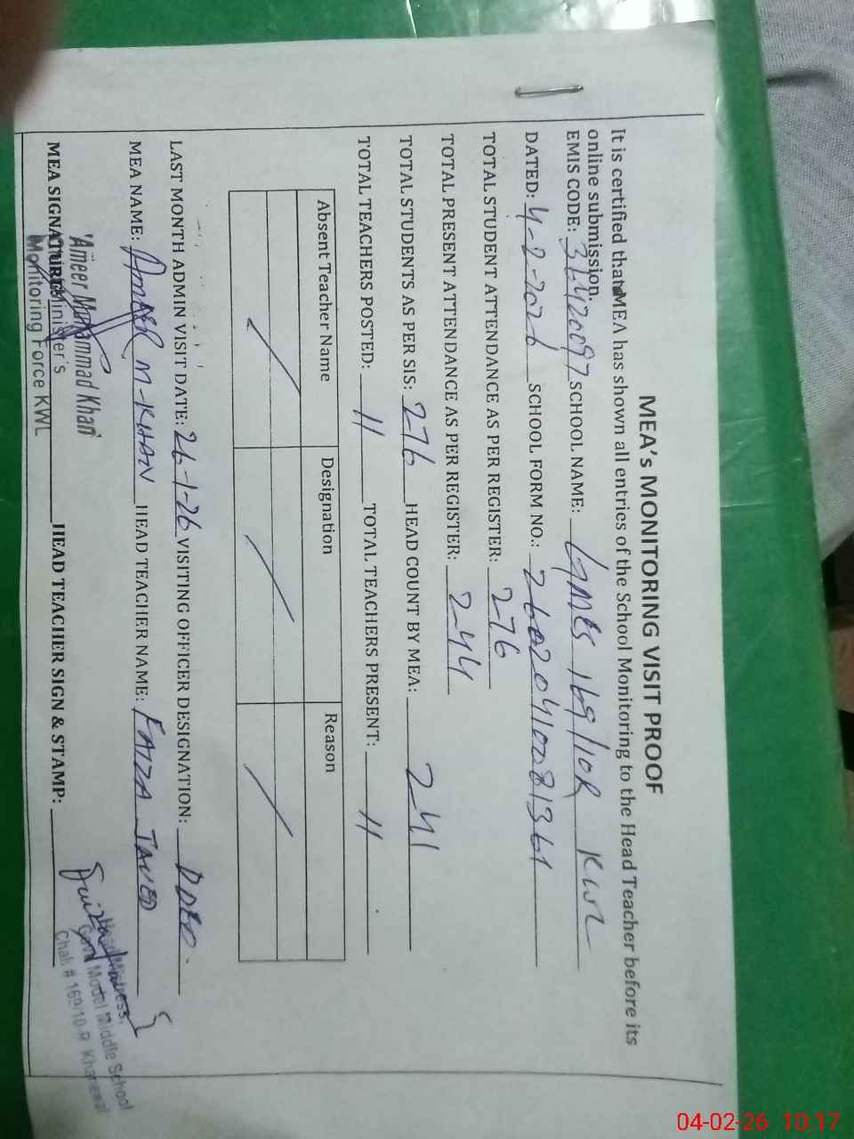 | Monitoring Date: 04-02-2026 | Start Time: 04-02-2026 09:58 AM | End Time: 04-02-2026 10:19 AM | Name of MEA: Am**** Mu**** Kh**** | |