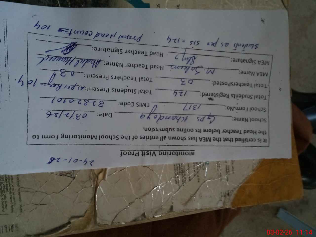 | Attendance Register | Head Teacher | MEA with School | Visit Proof |