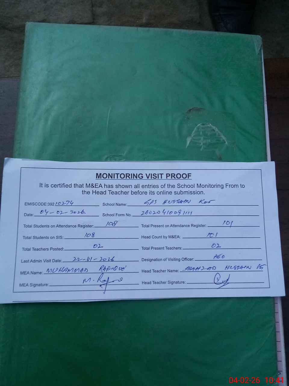 | Attendance Register | Head Teacher | MEA with School | Visit Proof |
