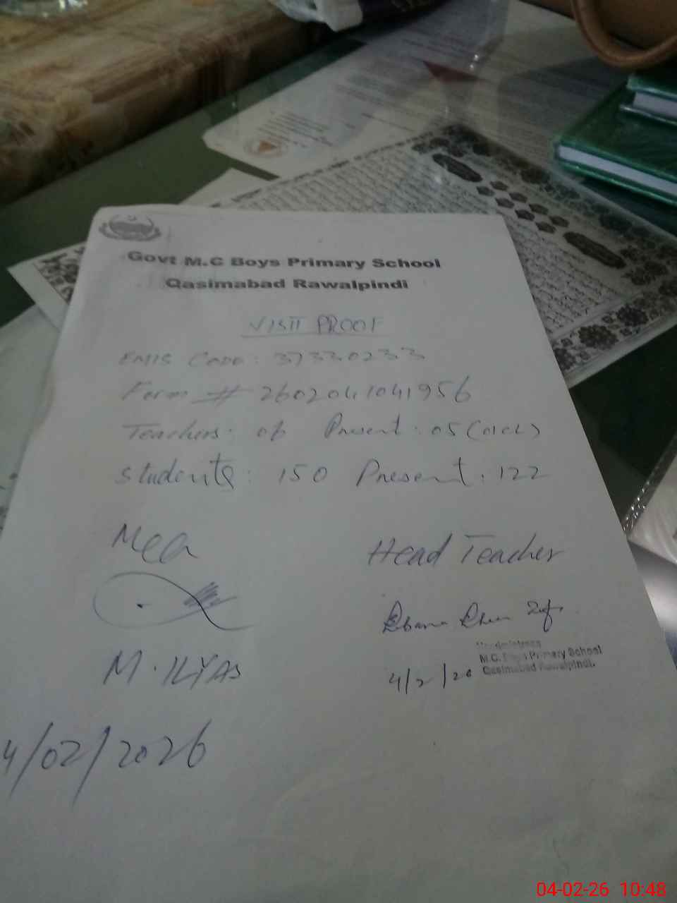 | Attendance Register | Head Teacher | MEA with School | Visit Proof |