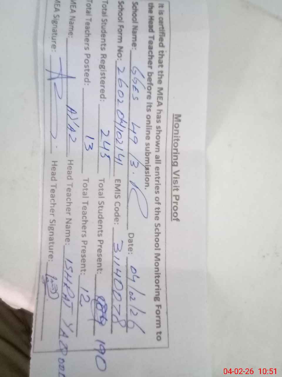 | Attendance Register | Head Teacher | MEA with School | Visit Proof |