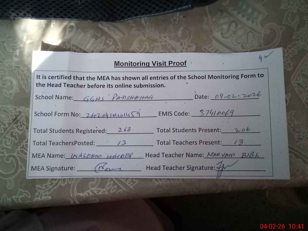 | Certified that this School was Inspected by the Undersigned MEA/DMO Today and the Information Stated Above is as Per Record. | |||||
