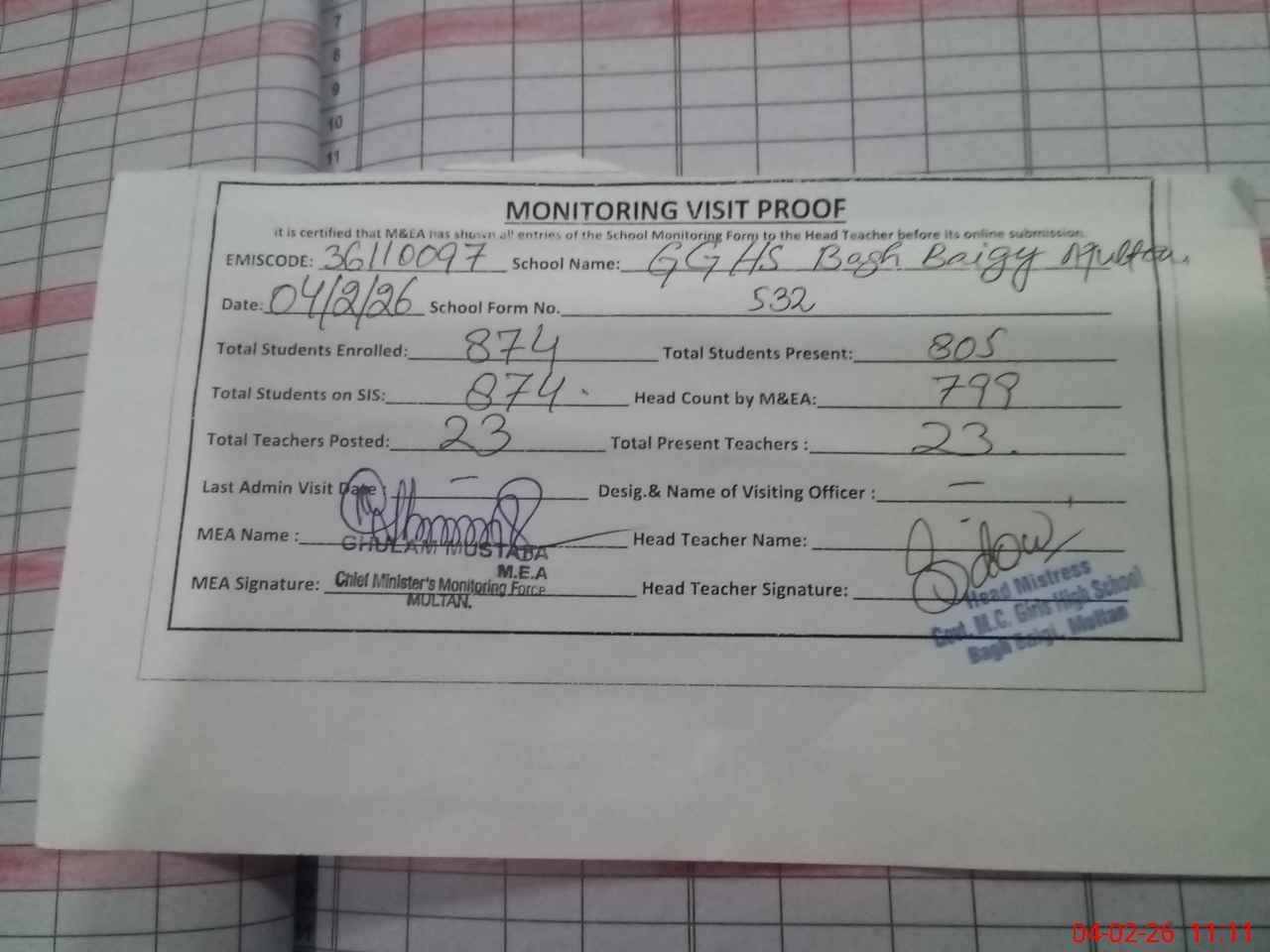 | EMIS Code: 36110097 | Name of School: GGHS MC BAGH BAIGY MULTAN | |||
