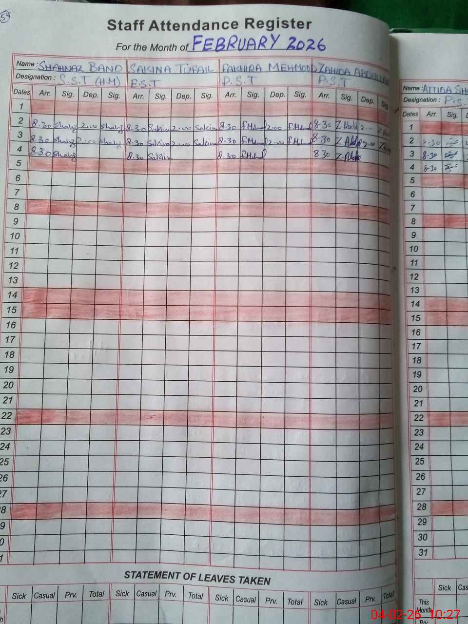 | No. of Students Present - Female | 0 | 0 | 28 | 25 | 22 | 21 | 19 | 25 | 25 | 20 | 234 | |||||