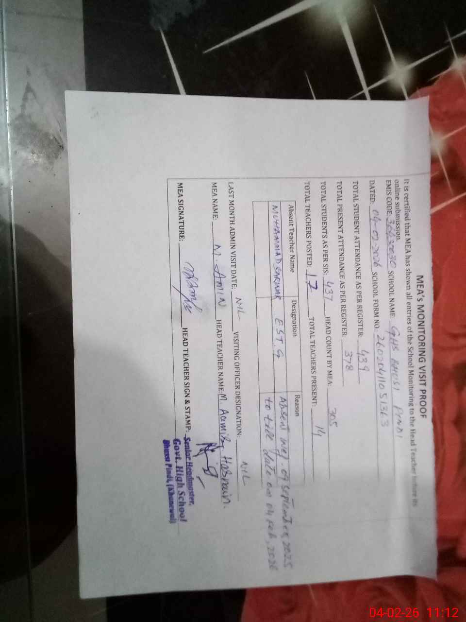 | Attendance Register | Head Teacher | MEA with School | Visit Proof |