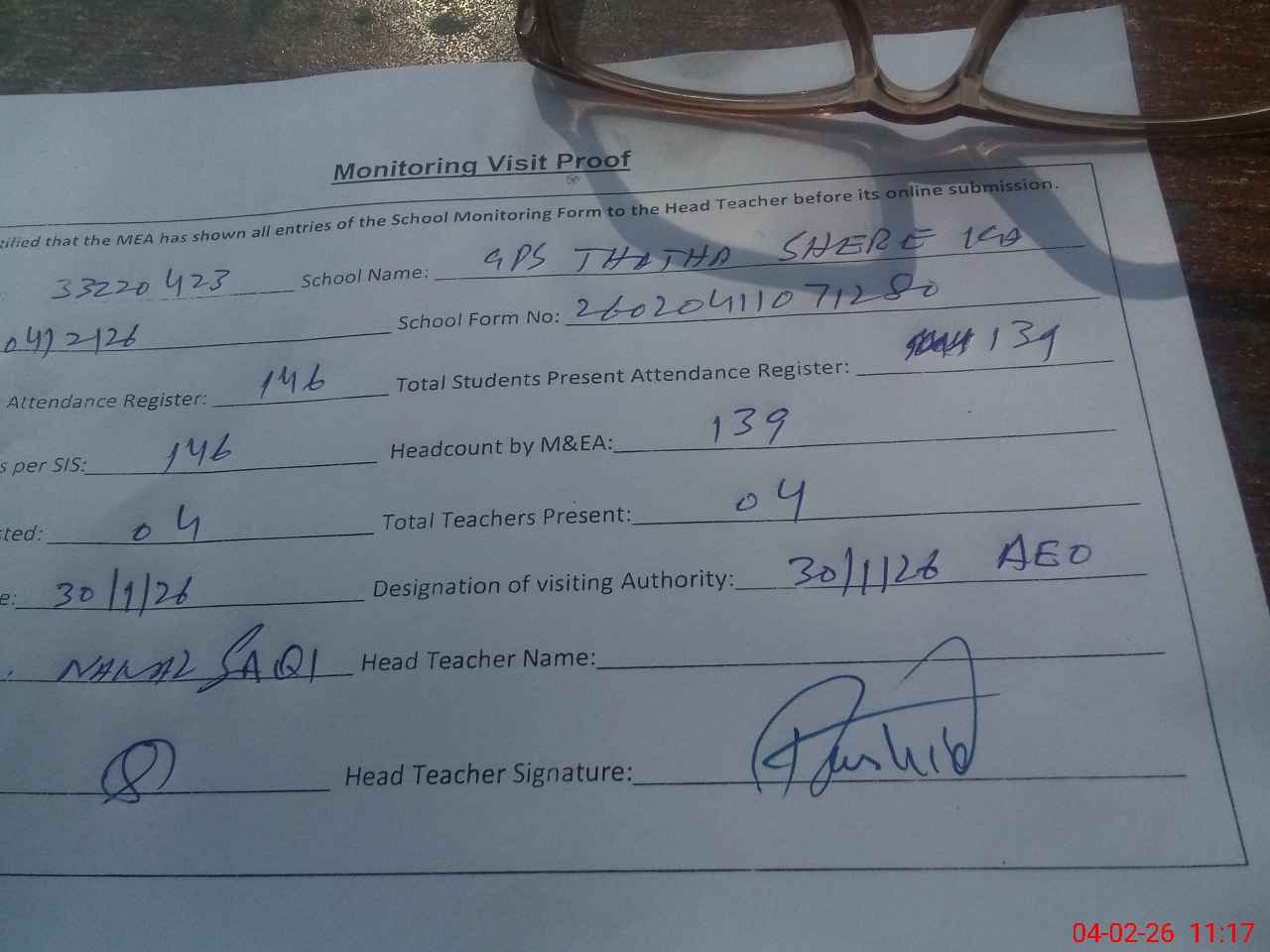 | Attendance Register | Head Teacher | MEA with School | Visit Proof |