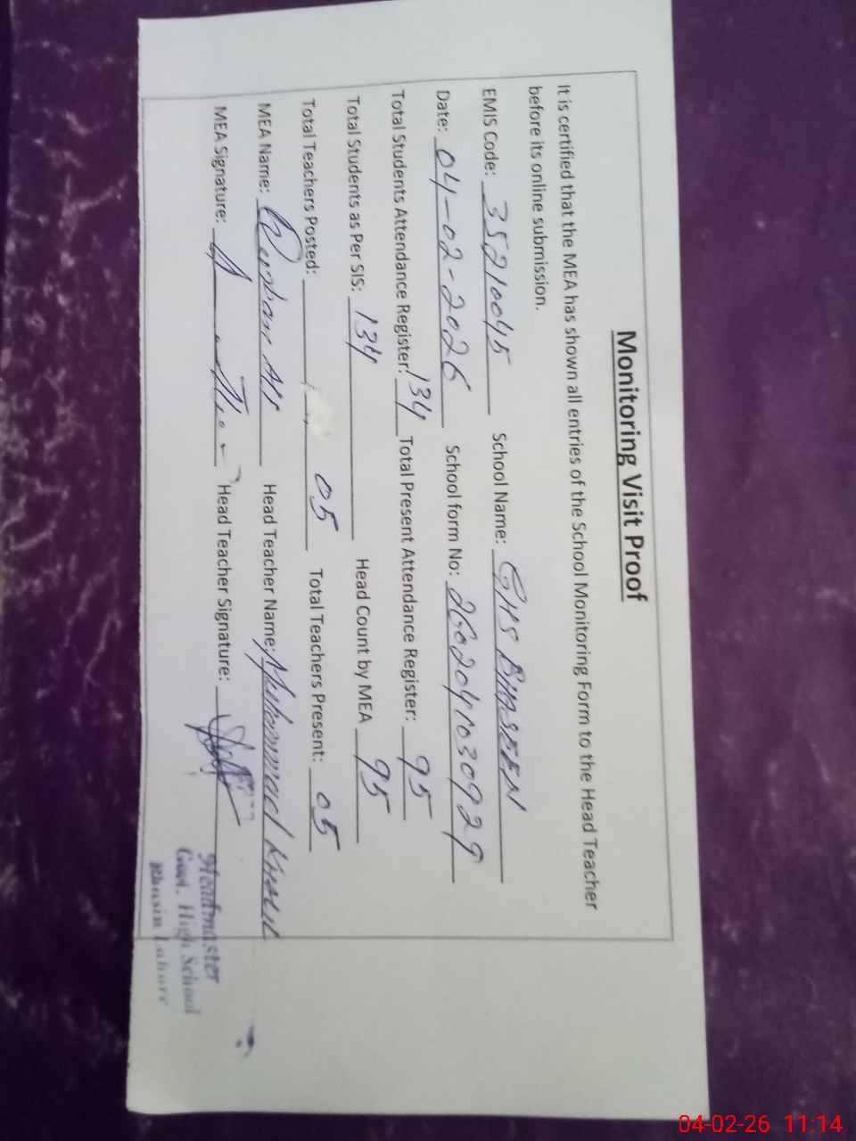 | Attendance Register | Head Teacher | MEA with School | Visit Proof |