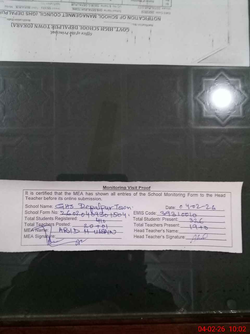 | Certified that this School was Inspected by the Undersigned MEA/DMO Today and the Information Stated Above is as Per Record. | |||||