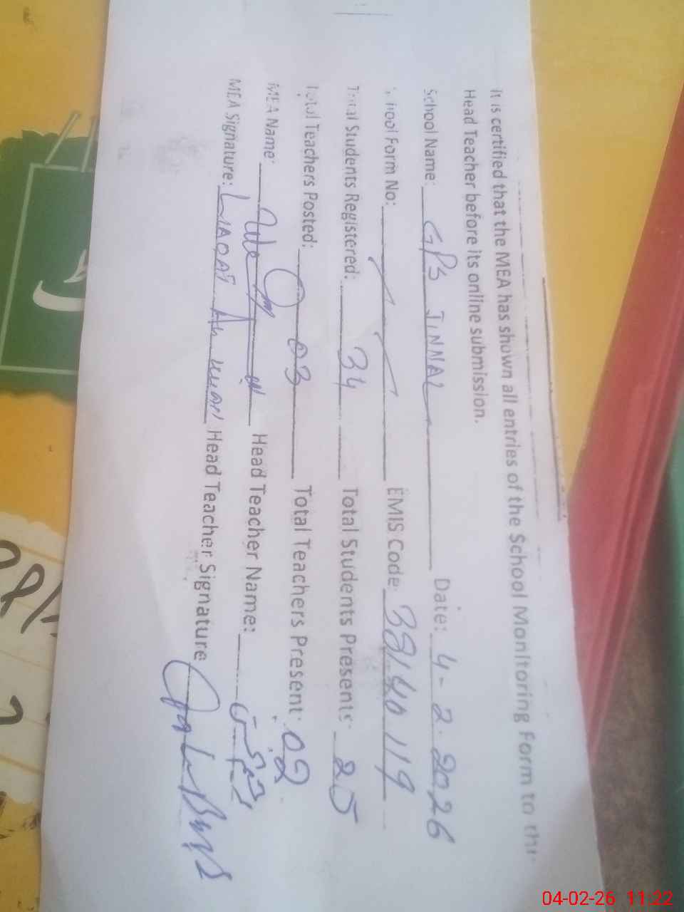 | EMIS Code: 38140119 | Name of School: GPS JINNAL | |||