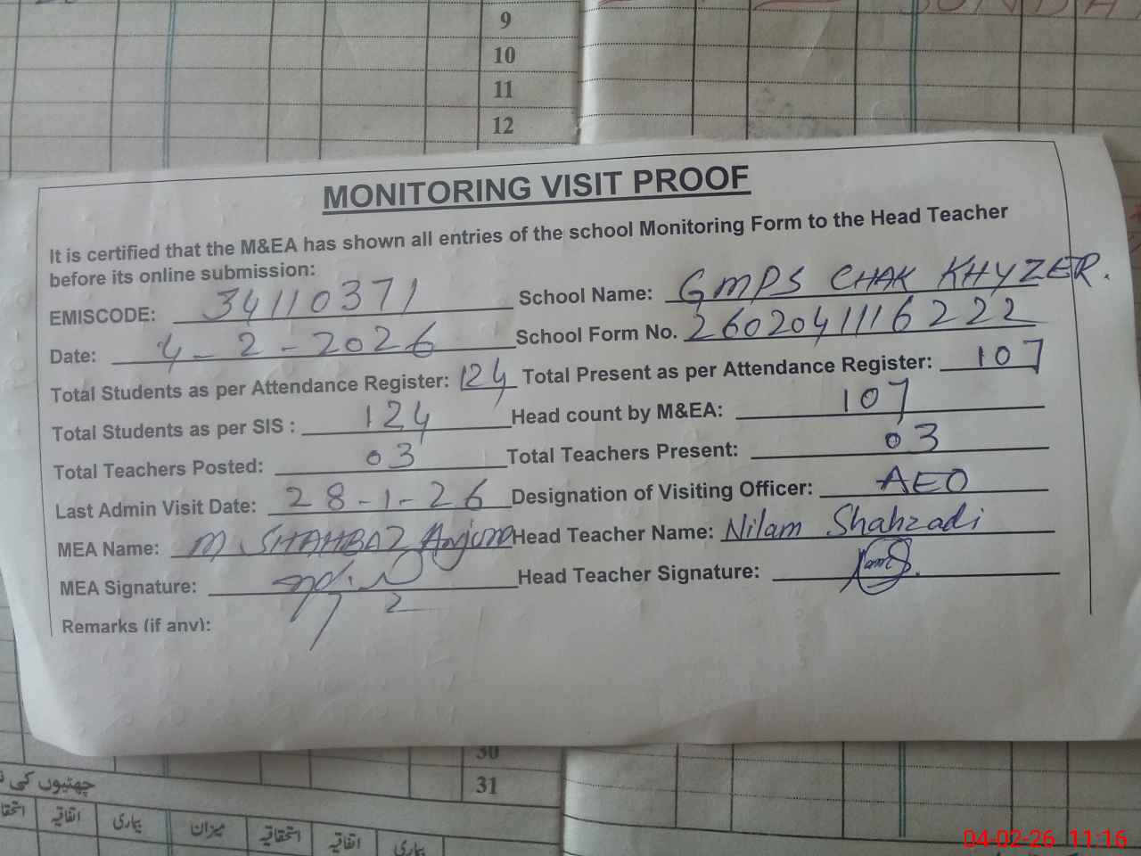 | Attendance Register | Head Teacher | MEA with School | Visit Proof |