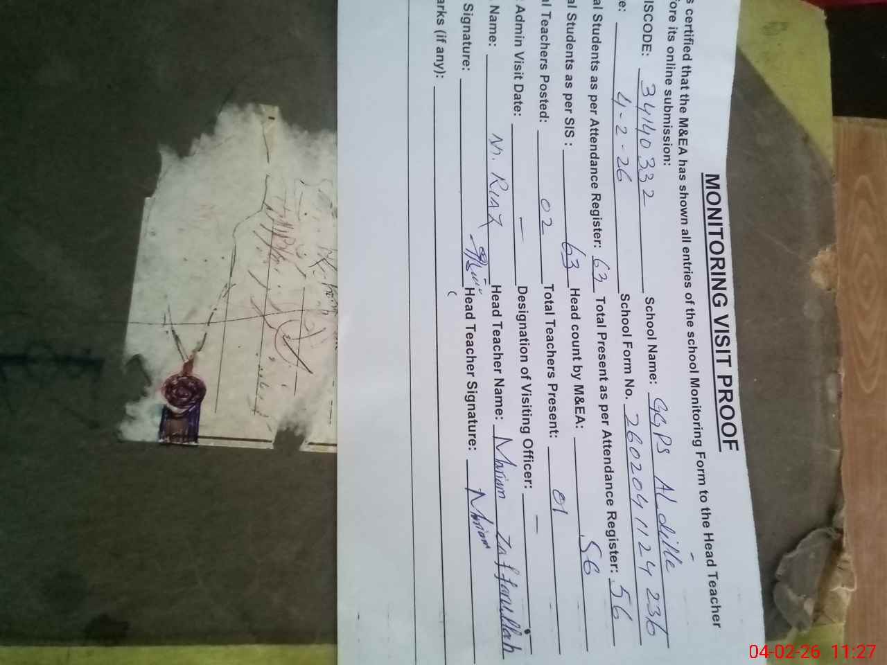 | Attendance Register | Head Teacher | MEA with School | Visit Proof |