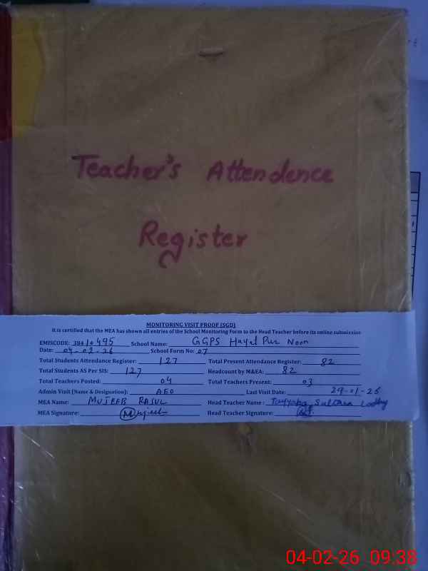| Attendance Register | Head Teacher | MEA with School | Visit Proof |