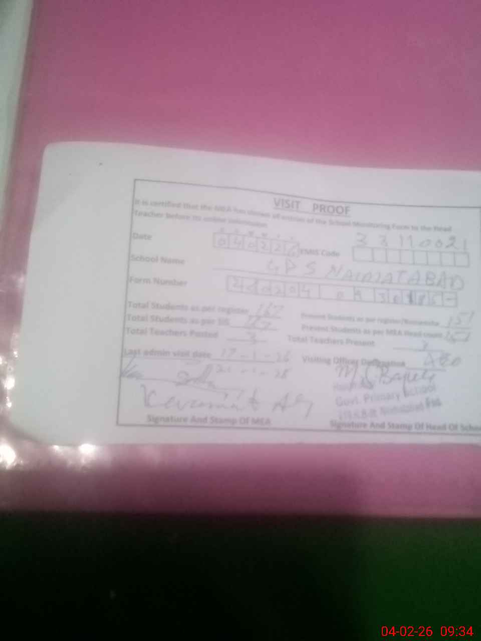 | Attendance Register | Head Teacher | MEA with School | Visit Proof |