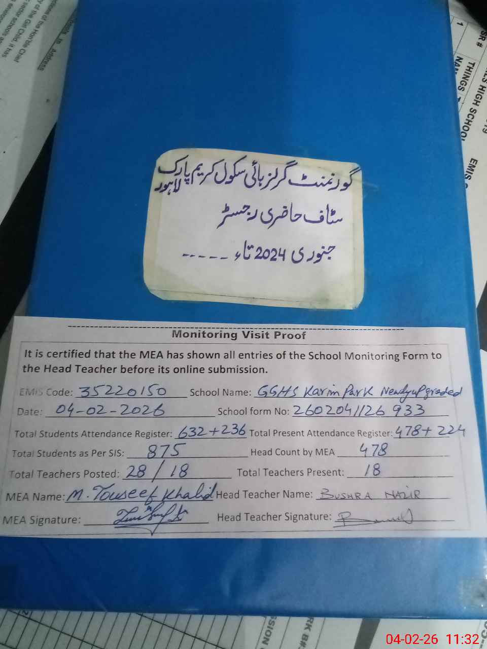 | Attendance Register | Head Teacher | MEA with School | Visit Proof |