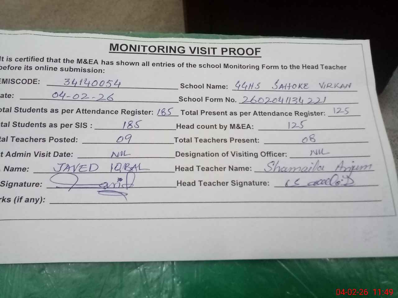| Attendance Register | Head Teacher | MEA with School | Visit Proof |