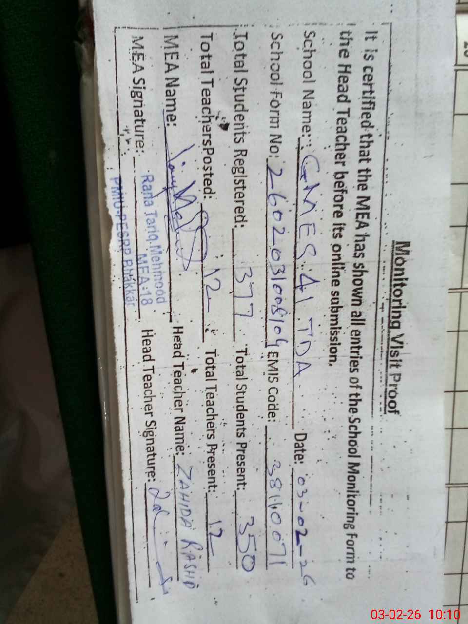 | Certified that this School was Inspected by the Undersigned MEA/DMO Today and the Information Stated Above is as Per Record. | |||||