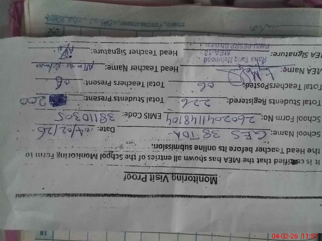 | Attendance Register | Head Teacher | MEA with School | Visit Proof |