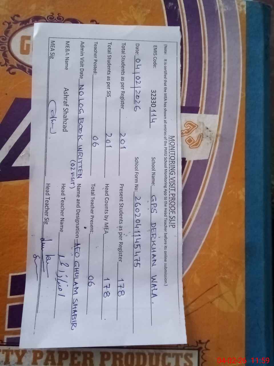 | Attendance Register | Head Teacher | MEA with School | Visit Proof |