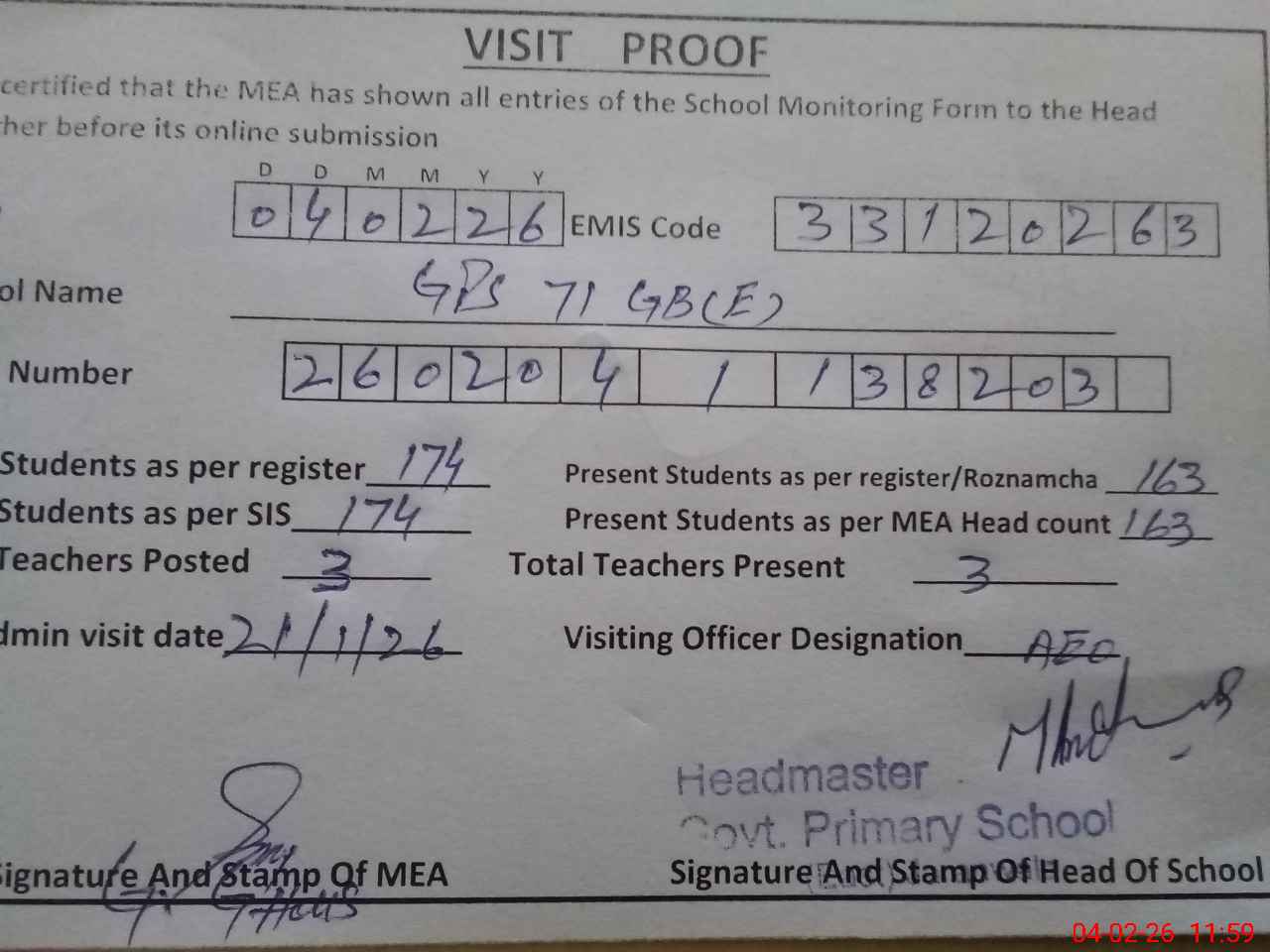 | Attendance Register | Head Teacher | MEA with School | Visit Proof |