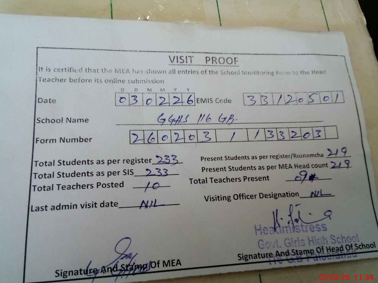| Attendance Register | Head Teacher | MEA with School | Visit Proof |
