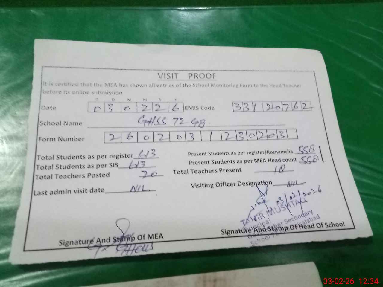 | Attendance Register | Head Teacher | MEA with School | Visit Proof |