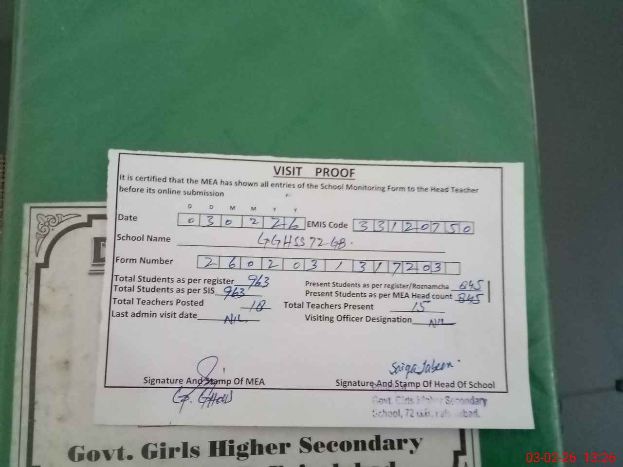 | EMIS Code: 33120750 | Name of School: GGHSS CHAK 72 GB | |||