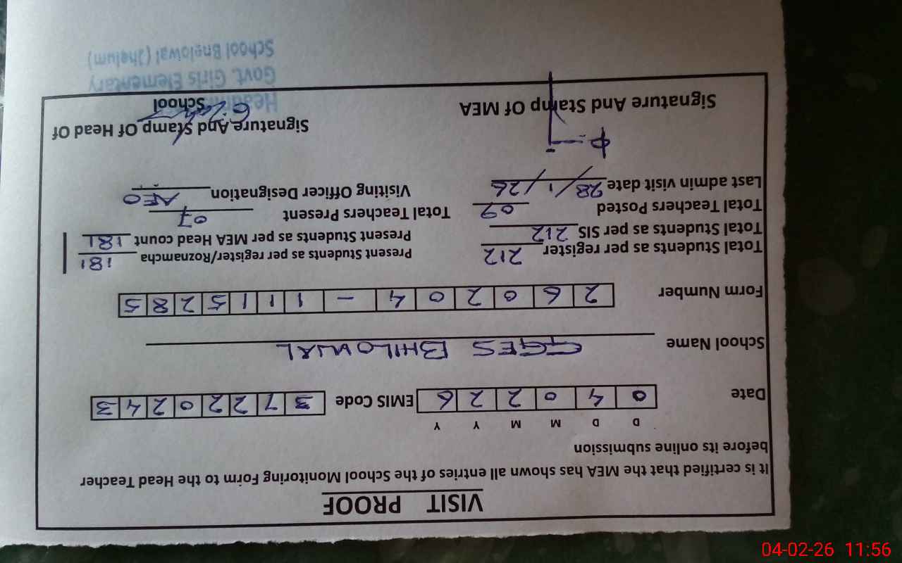 | Attendance Register | Head Teacher | MEA with School | Visit Proof |