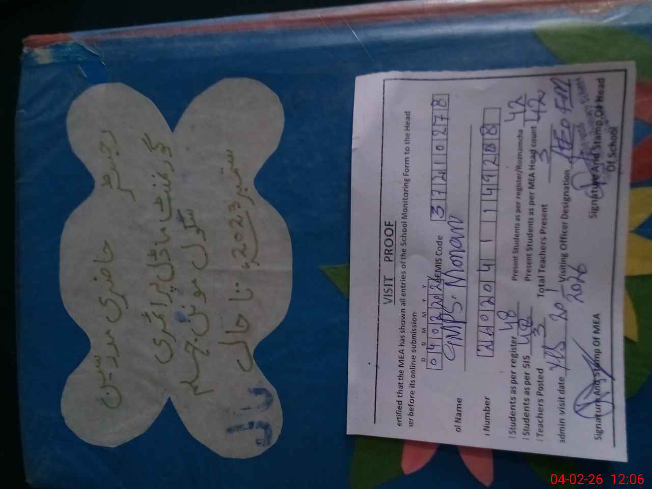 | Attendance Register | Head Teacher | MEA with School | Visit Proof |