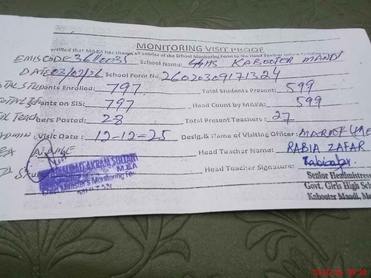 | EMIS Code: 36110035 | Name of School: GGHS KABOOTER MANDI MULTAN WARD NO. 7 | |||
