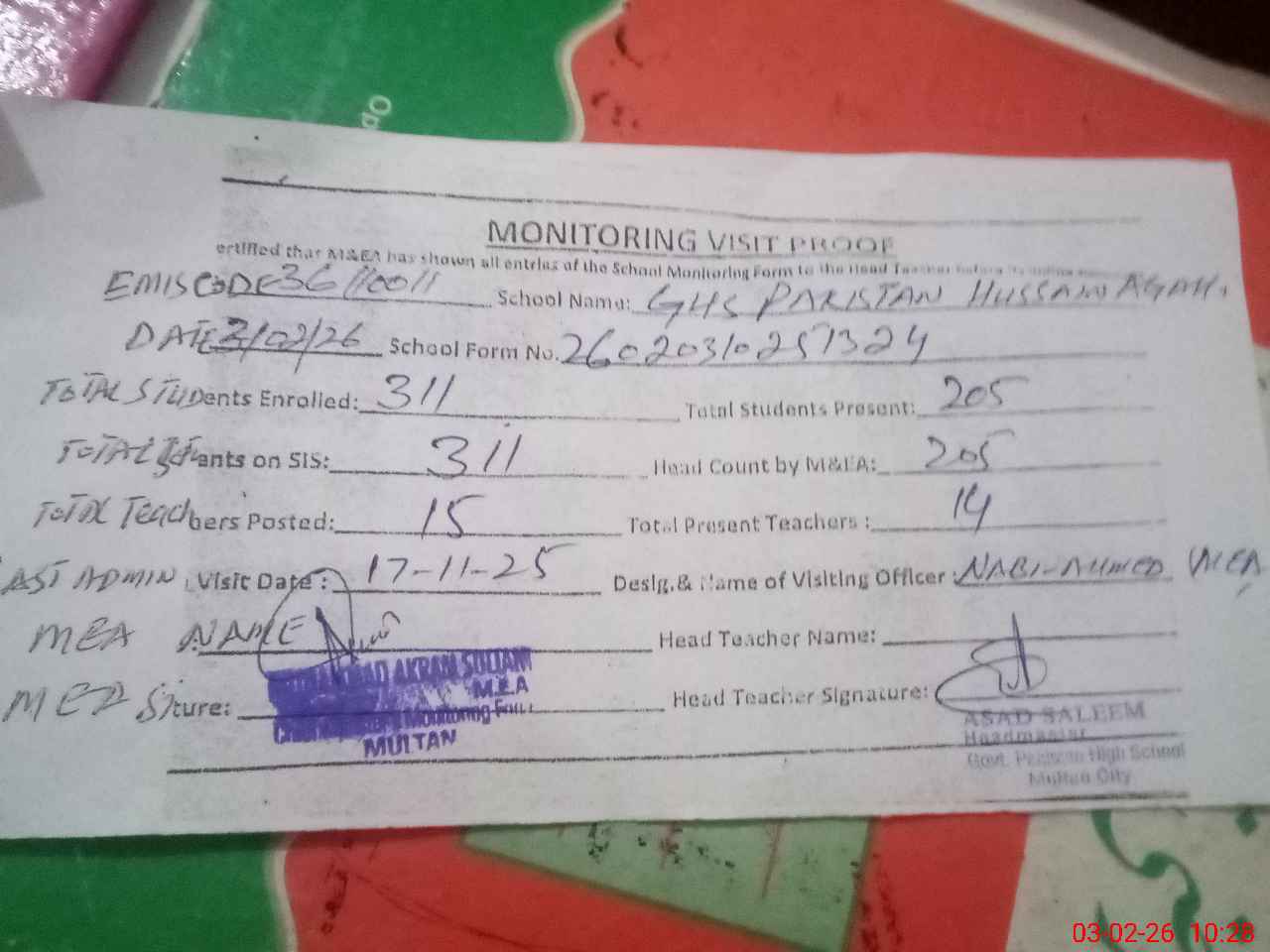 | EMIS Code: 36110011 | Name of School: GHS PAKISTAN HUSSAIN AGAHI | |||